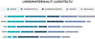 Jos optinen selkeys on tärkein huolenaiheesi, mikään ei voita lasia. Aktiivista elämäntapaa varten polykarbonaatti- tai trivex-linssit tarjoavat kestävyyttä ja suojaa. TAC-linssit ovat loistavia häikäisyn vähentämiseen ilman, että ne vievät rahaa, kun taas CR-39-linssit ovat sopiva keskitie jokapäiväiseen käyttöön.