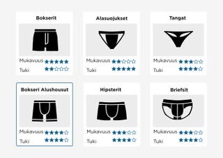 Mitä voitat mukavuudessa, menetät tuessa. Bokserit voivat olla hieman liian löysät aktiiviseen käyttöön, ja ne saattavat kasautua ohuiden housujen alle. Ei paras valinta, jos haluat tyylikkään siluetin.