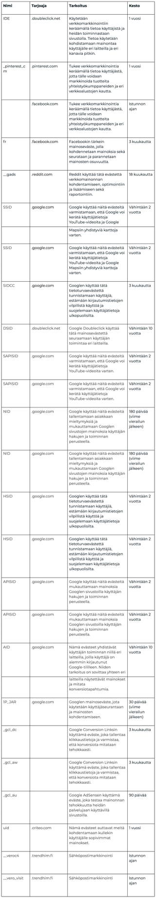 Käytämme seuranta- ja tilastoevästeitä sekä teknisiä evästeitä. Antaaksemme sinulle niin paljon tietoa evästeistä kuin mahdollista olemme listanneet useimmat evästeet alla: